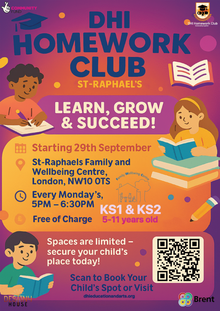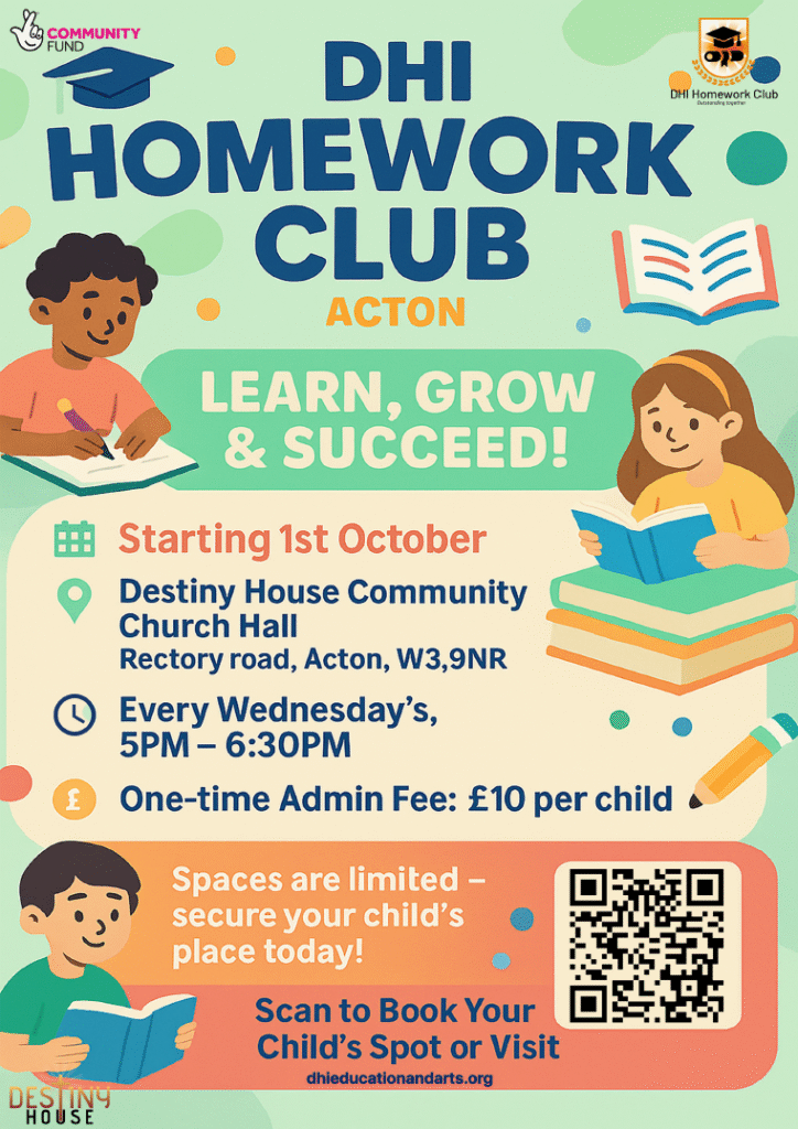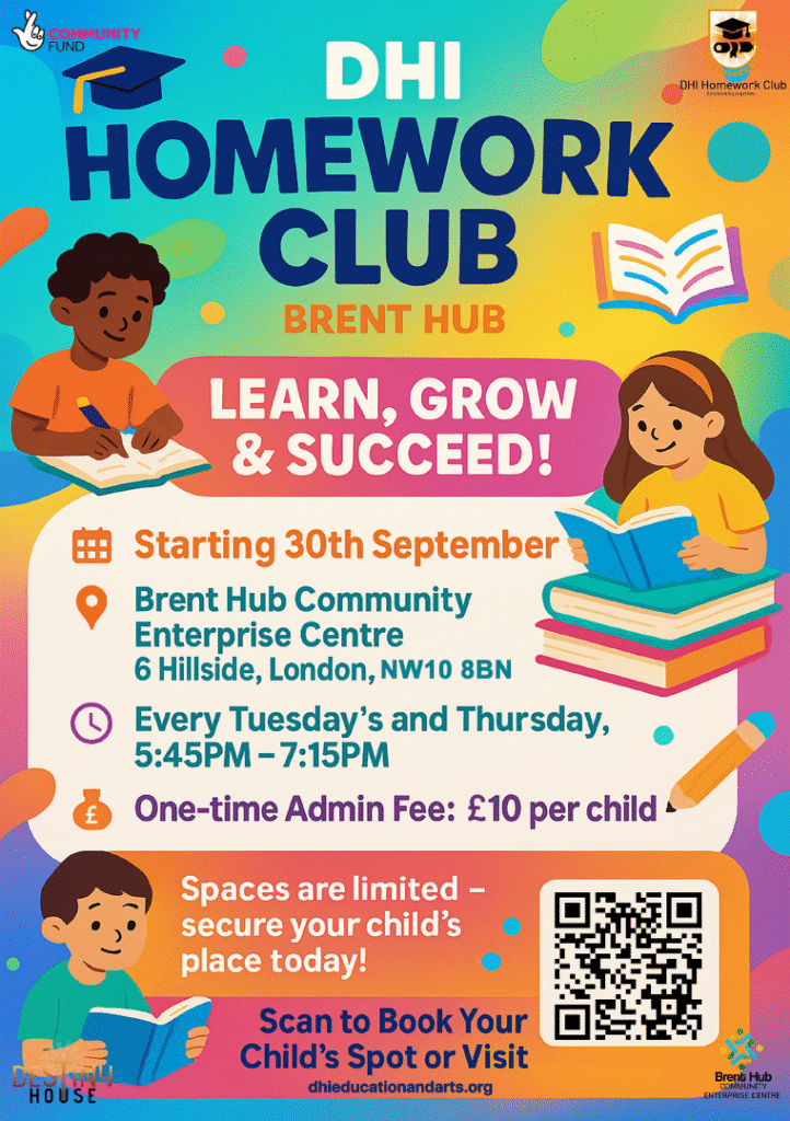DHI Acton Homework club is back on the 1st of October! Sessions will run on Wednesdays from 5.45pm to 7.15pm. Register your child now! Go to our Homework club page to fill in the form.