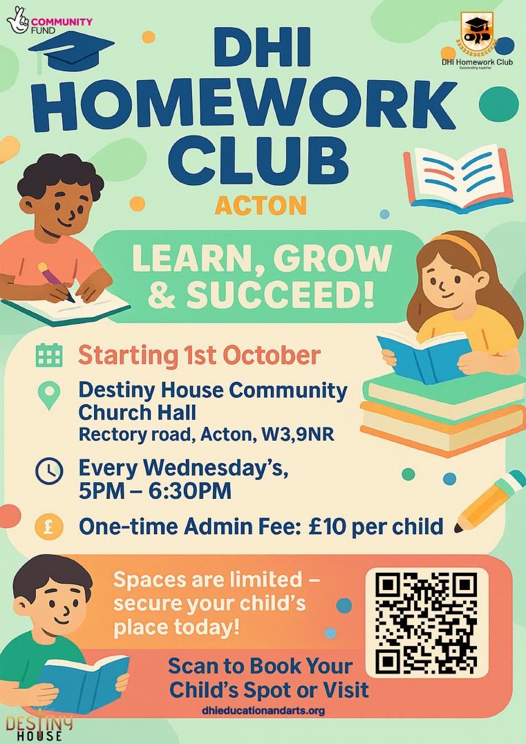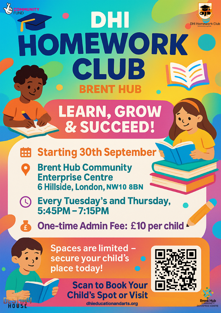 DHI Acton Homework club is back on the 1st of October! Sessions will run on Wednesdays from 5.45pm to 7.15pm. Register your child now! Go